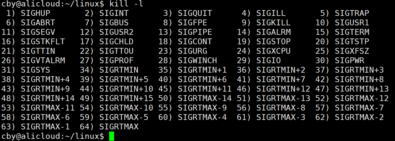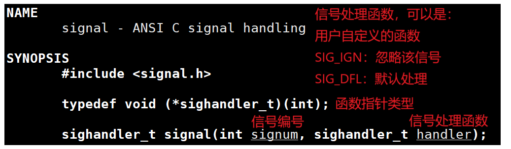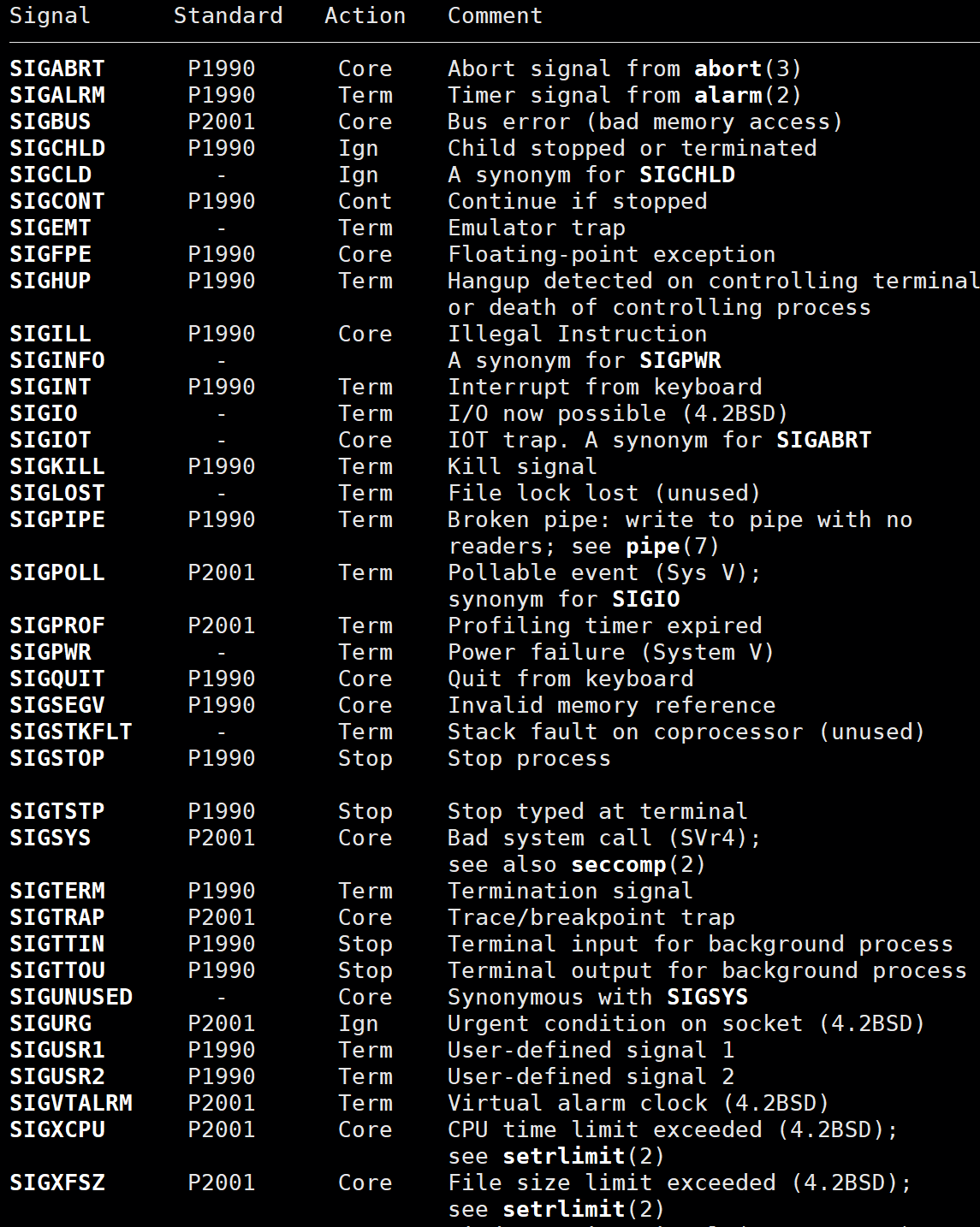 编号34以上的是实时信号,本章只讨论编号34以下的信号,不讨论实时信号。这些信号各自在什么条件下产生,默认的处理动作是什么,在signal(7)中都有详细说明: man 7 signal