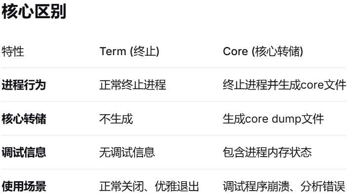 信号处理:对 Term 信号实现优雅关闭,对 Core 信号记录调试信息