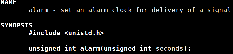 调用 alarm 函数可以设定一个闹钟,也就是告诉内核在seconds 秒之后给当前进程发SIGALRM 信号,该信号的默认处理动作是终止当前进程。