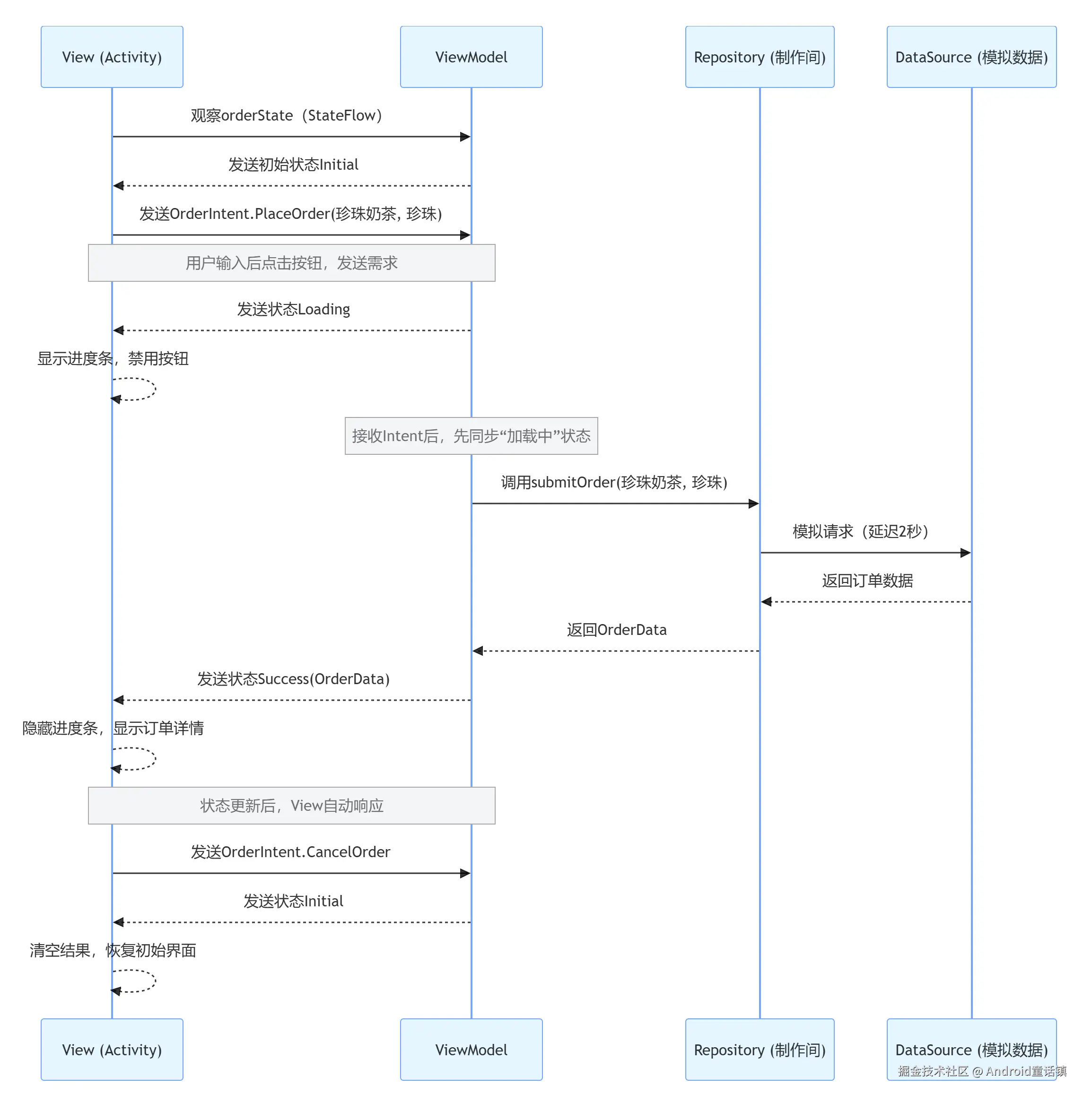 DataSource (模拟数据)Repository (制作间)ViewModelView (Activity)DataSource (模拟数据)Repository (制作间)ViewModelView (Activity)用户输入后点击按钮,发送需求接收Intent后,先同步"加载中"状态状态更新后,View自动响应观察orderState(StateFlow)发送初始状态Initial发送OrderIntent.PlaceOrder(珍珠奶茶, 珍珠)发送状态Loading显示进度条,禁用按钮调用submitOrder(珍珠奶茶, 珍珠)模拟请求(延迟2秒)返回订单数据返回OrderData发送状态Success(OrderData)隐藏进度条,显示订单详情发送OrderIntent.CancelOrder发送状态Initial清空结果,恢复初始界面