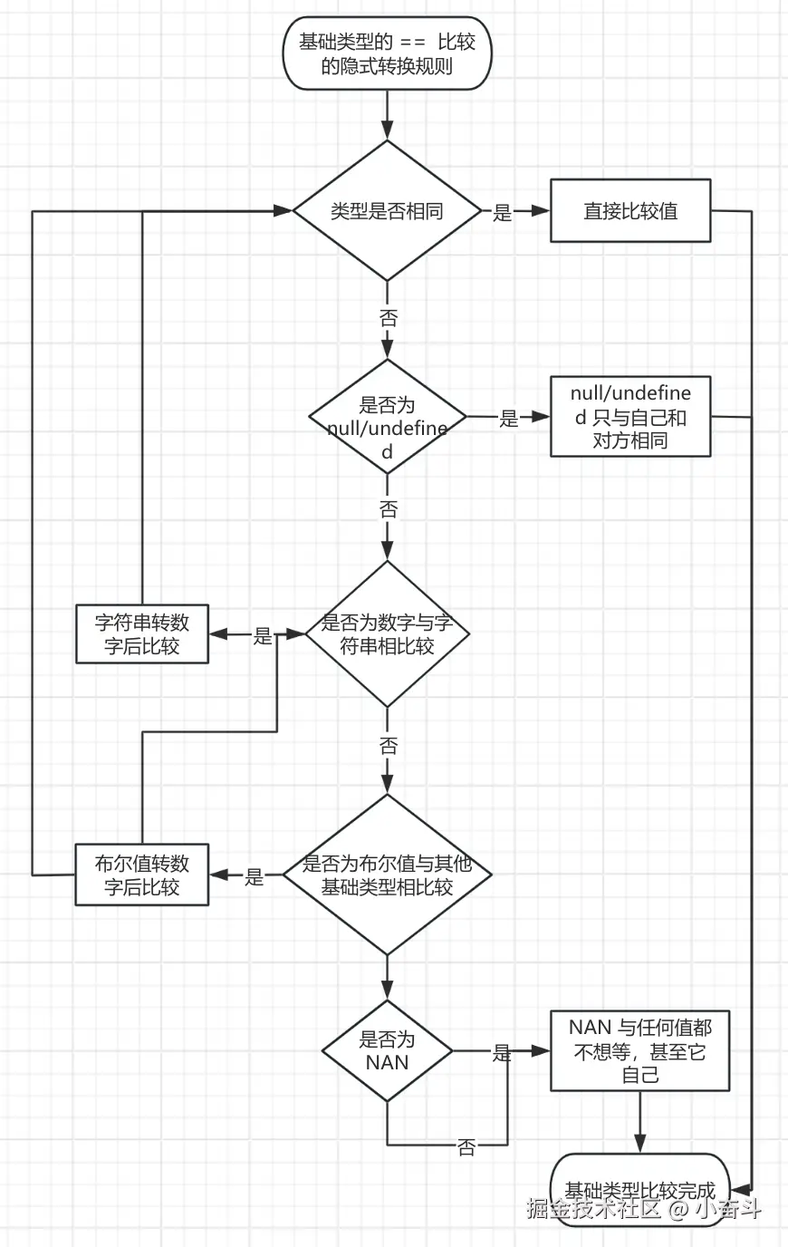 - 基础类型的隐式转换,字符串与字符串类型进行比较,类型相同值相同