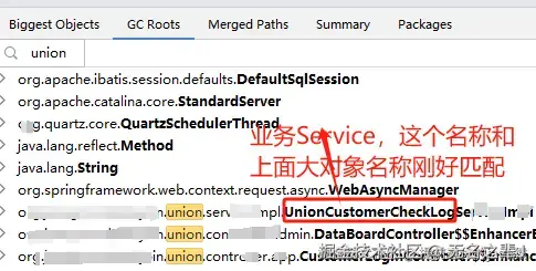 我们搜索自己的业务包名字就行了,这样就能很快定位关键问题。发现存在service 名称 和 上面大对象的名称一致UnionCustomerCheckLog