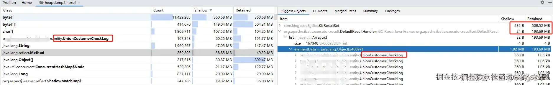 这两个就占了700M. 算是定位到问题了吧! 也推翻了技术经理说的调用远程接口大量请求被阻塞的问题。