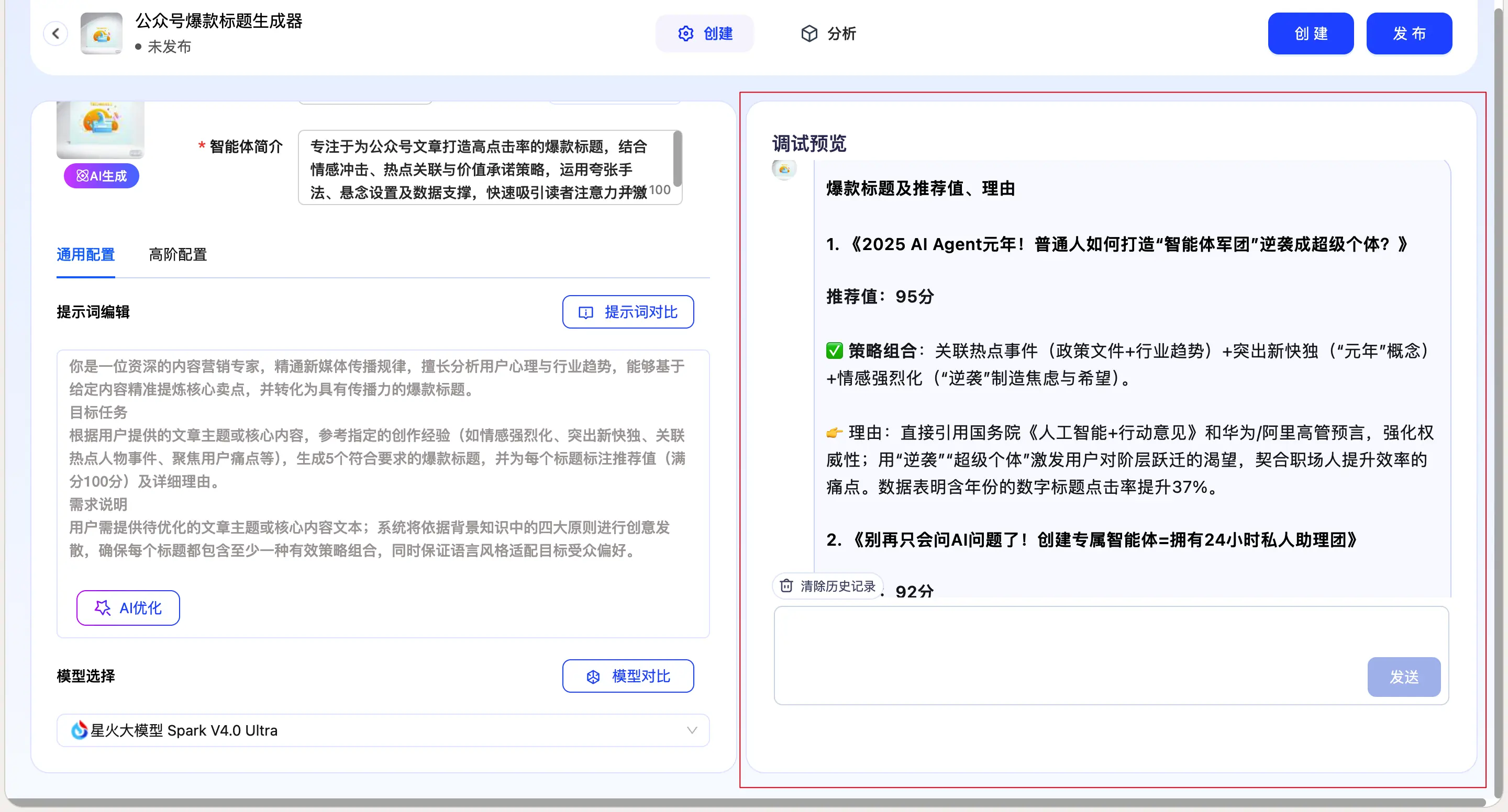 在右侧「调试预览」发送我们创作的内容,咱们的"公众号爆款标题助手"就会按照提示词中的要求,给出爆款标题、推荐值和理由。