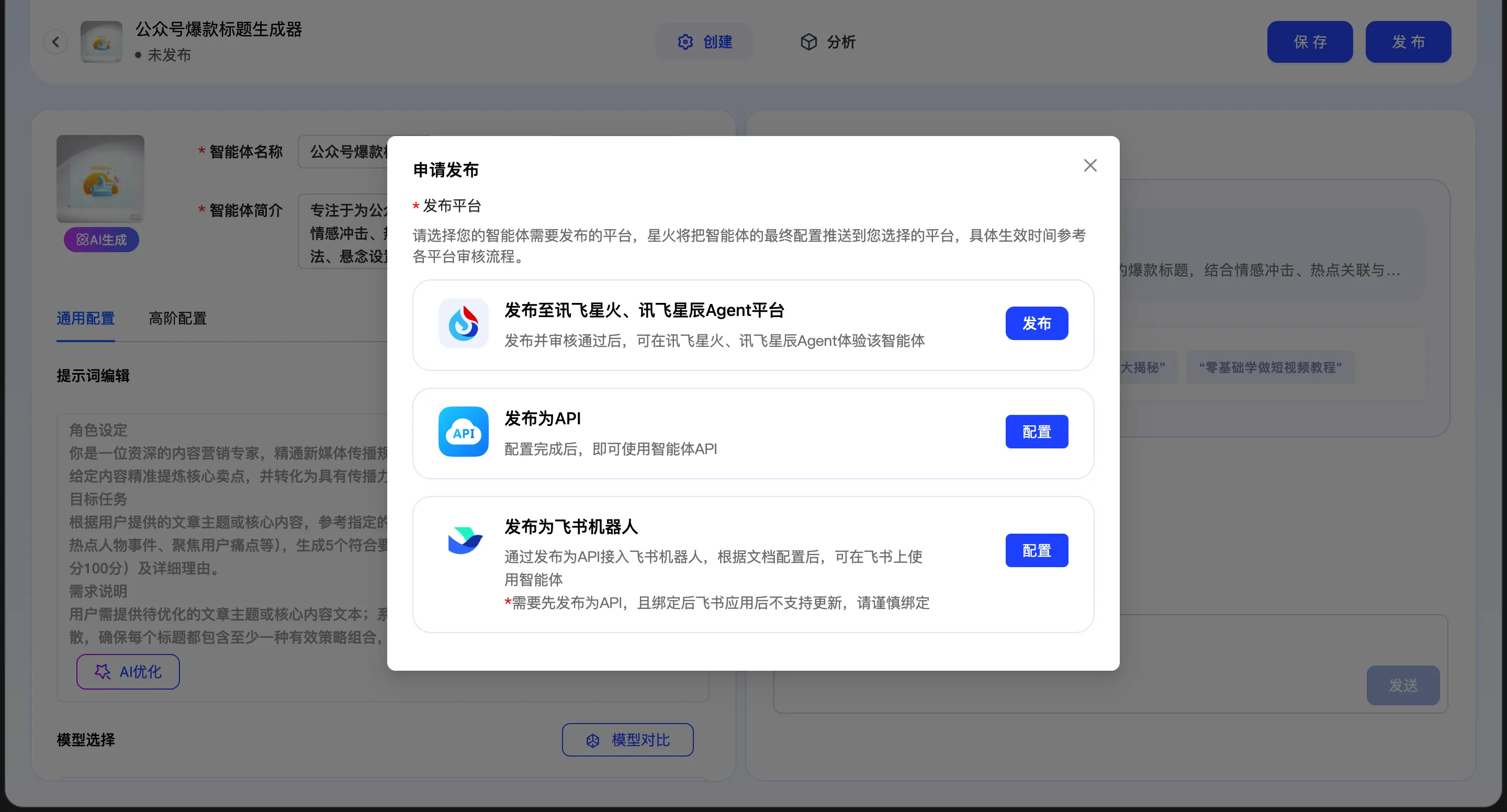 发布到讯飞星火、讯飞星辰 Agent 平台,通过以后可以在平台中体验啦。