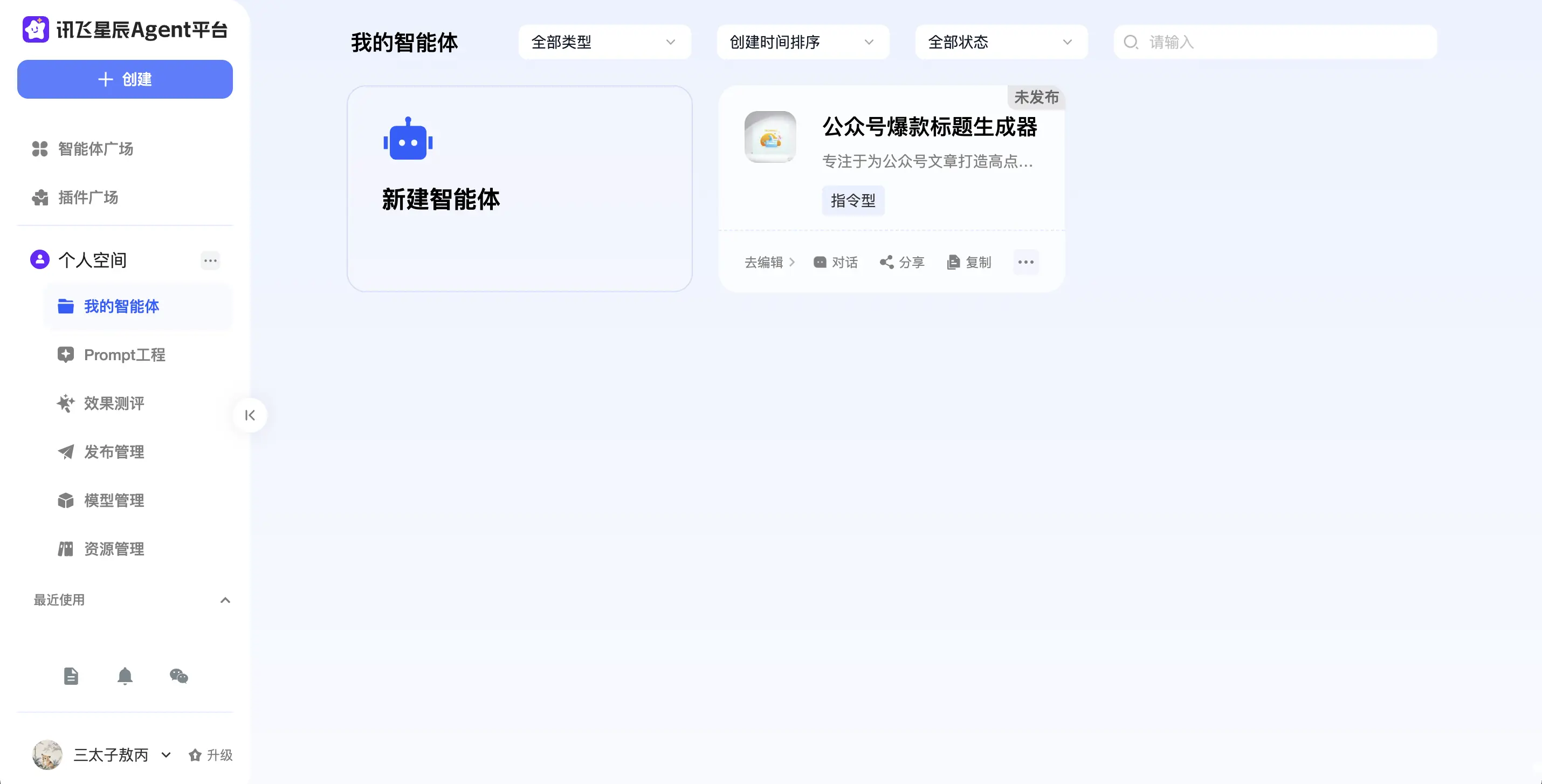 创建好的智能体,在个人空间的「我的智能体」中可以继续编辑、对话、分享给他人使用等。