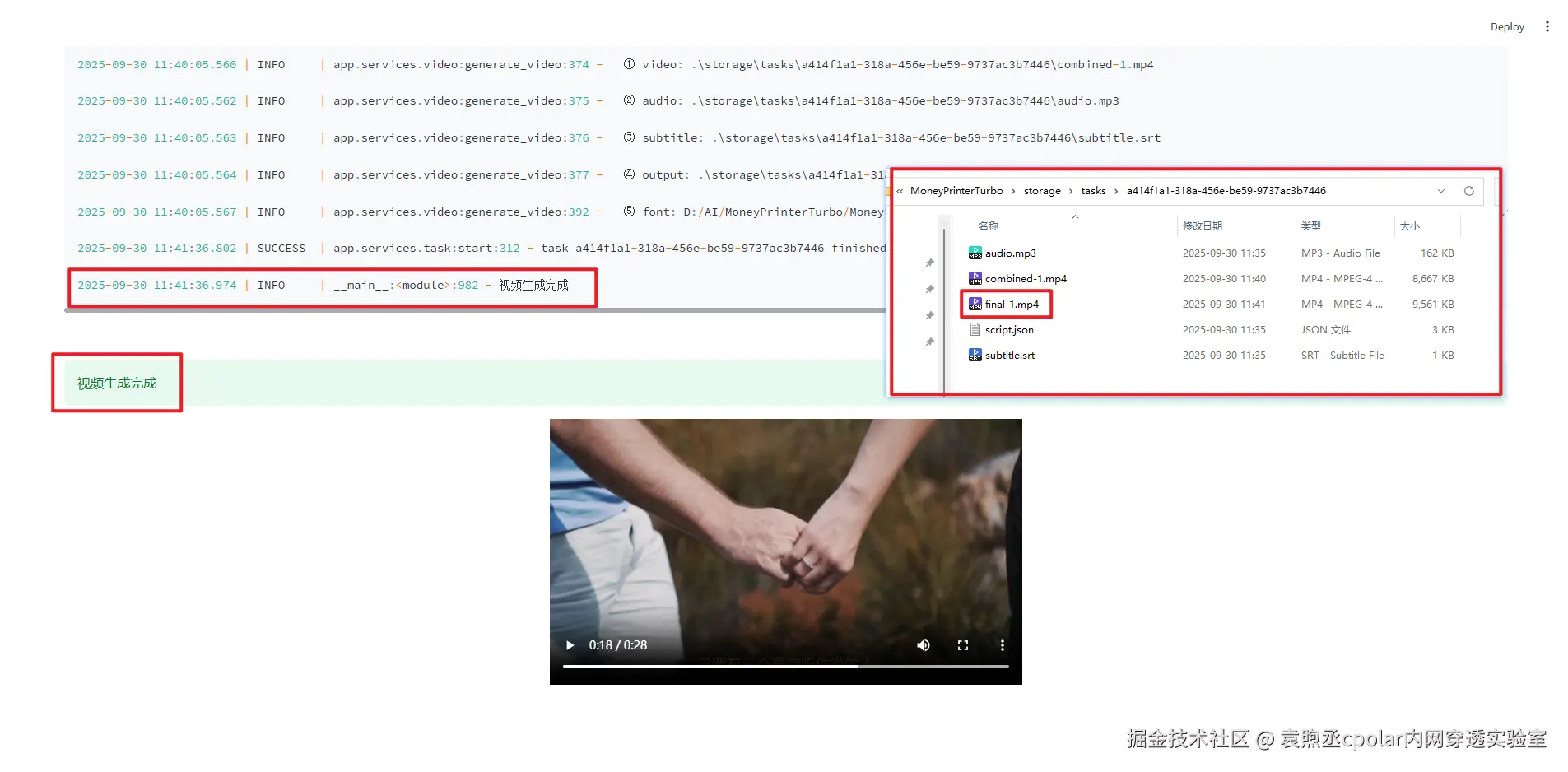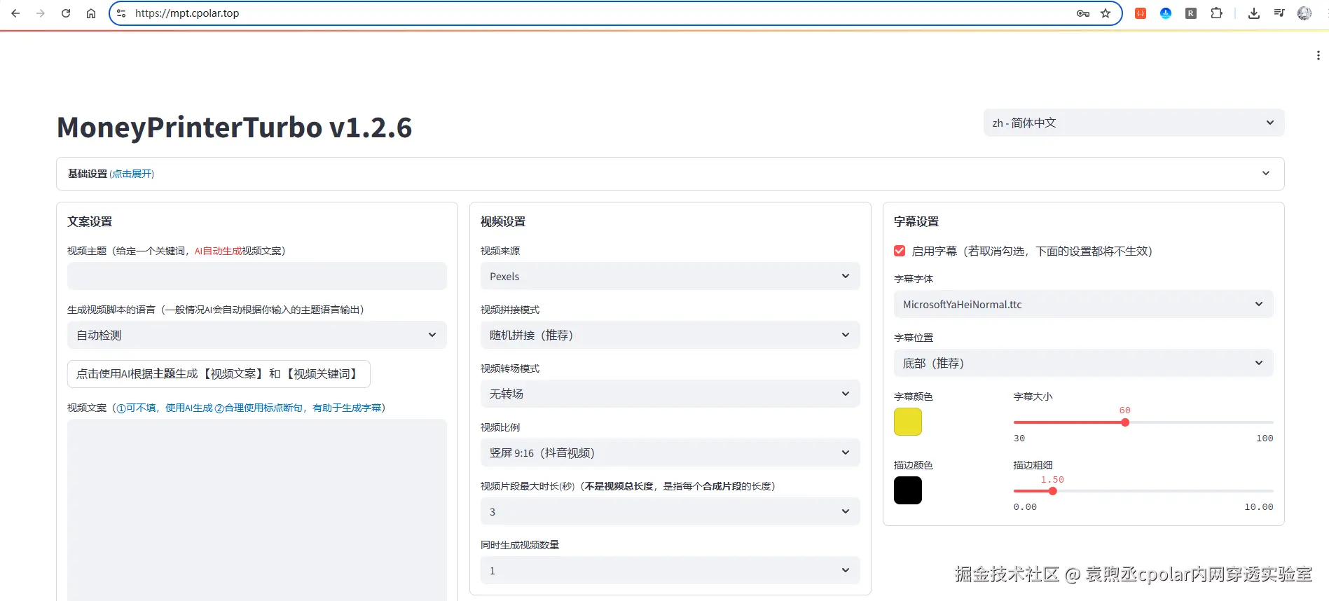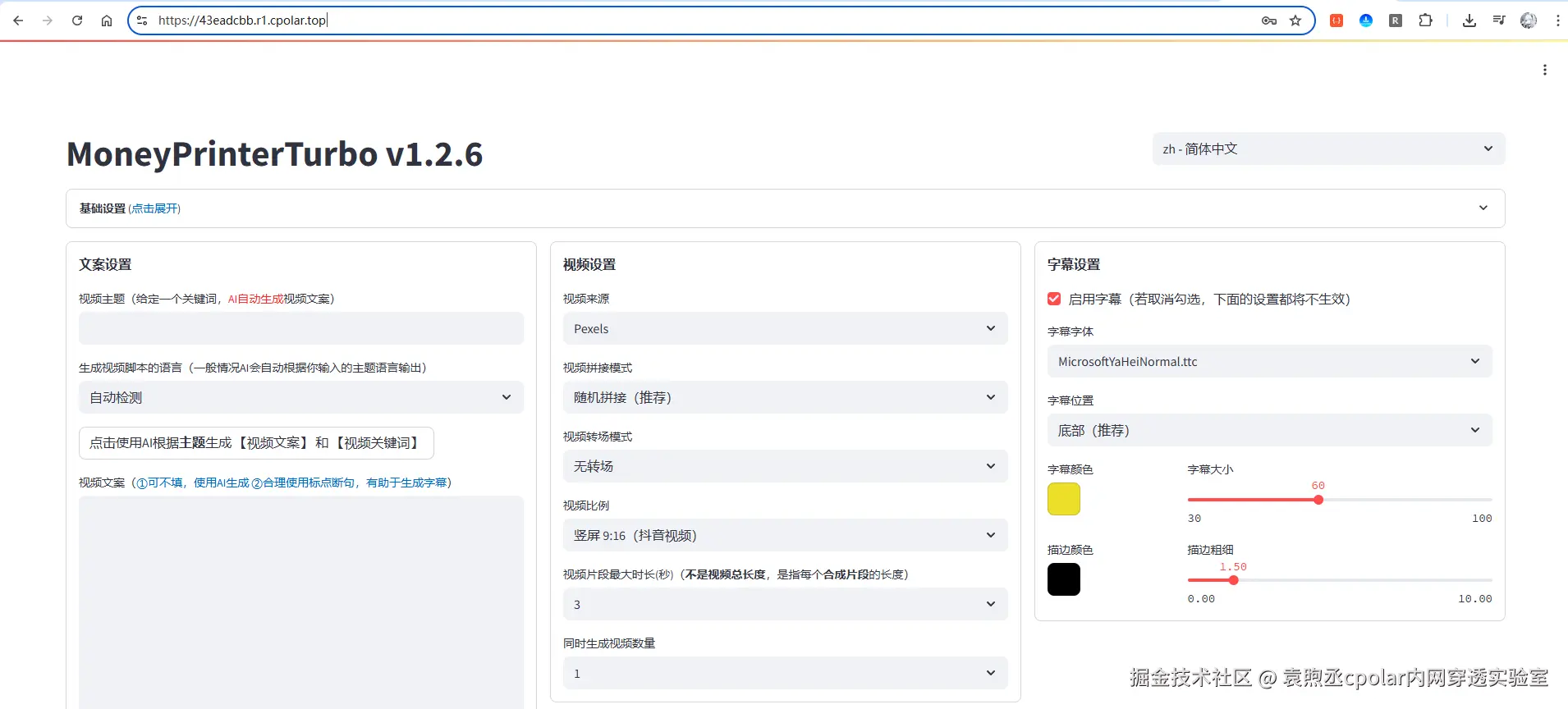 本文带你完整实现了 MoneyPrinterTurbo + cpolar 的远程可控自动化视频生成平台搭建: