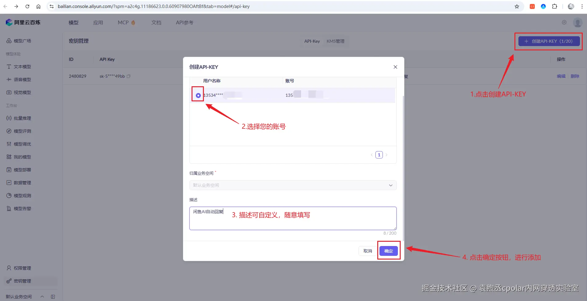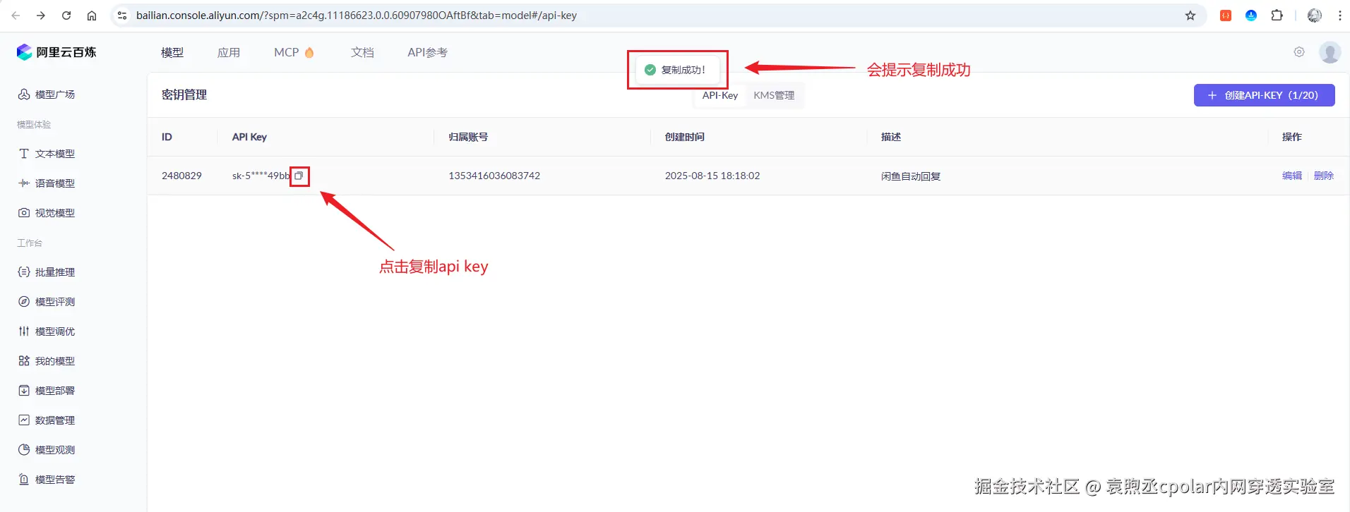 领取完成后,接下来进入密钥管理,设置设置千问api密钥: 密钥管理地址: