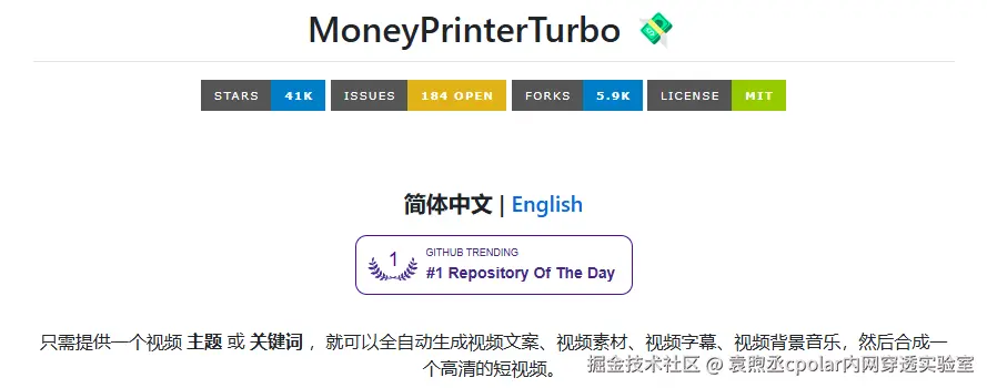 MoneyPrinterTurbo如同给内容创作者装上了"AI外挂",让短视频生产从"手工活"升级为"全自动生产线"。而结合cpolar内网穿透技术,更是打破了物理距离的束缚------无论素材、模型还是设备资源,都能随时随地调用。这对需要跨团队协作或依赖本地化数据的企业而言,简直是"效率神器+安全锁"的完美组合!
