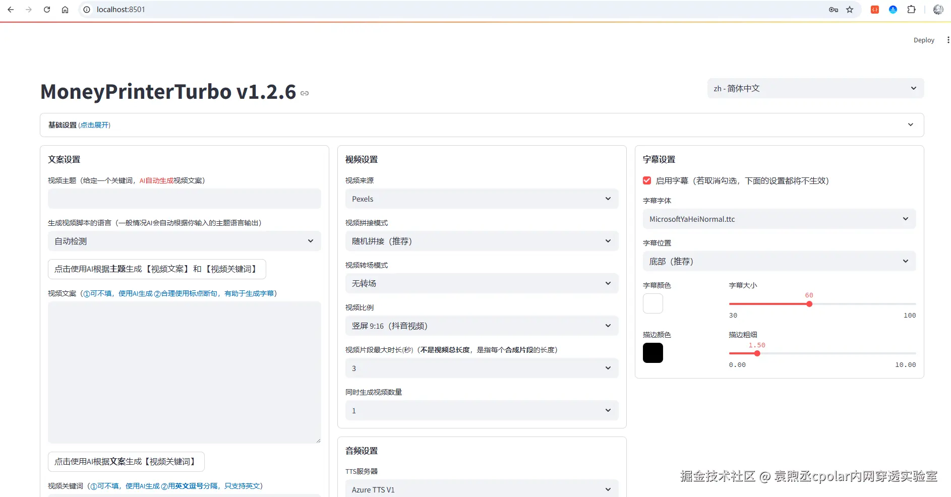 在完成公网部署后,你会发现 MoneyPrinterTurbo