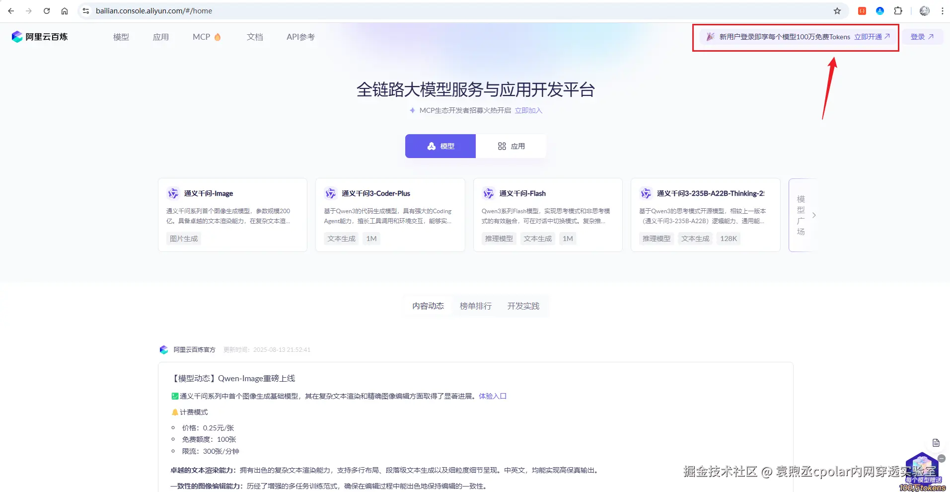 首先,咱们需要领取千问百万tokens,来到阿里云百炼官网,点击右上角新用户登录即享每个模型100万免费tokens: