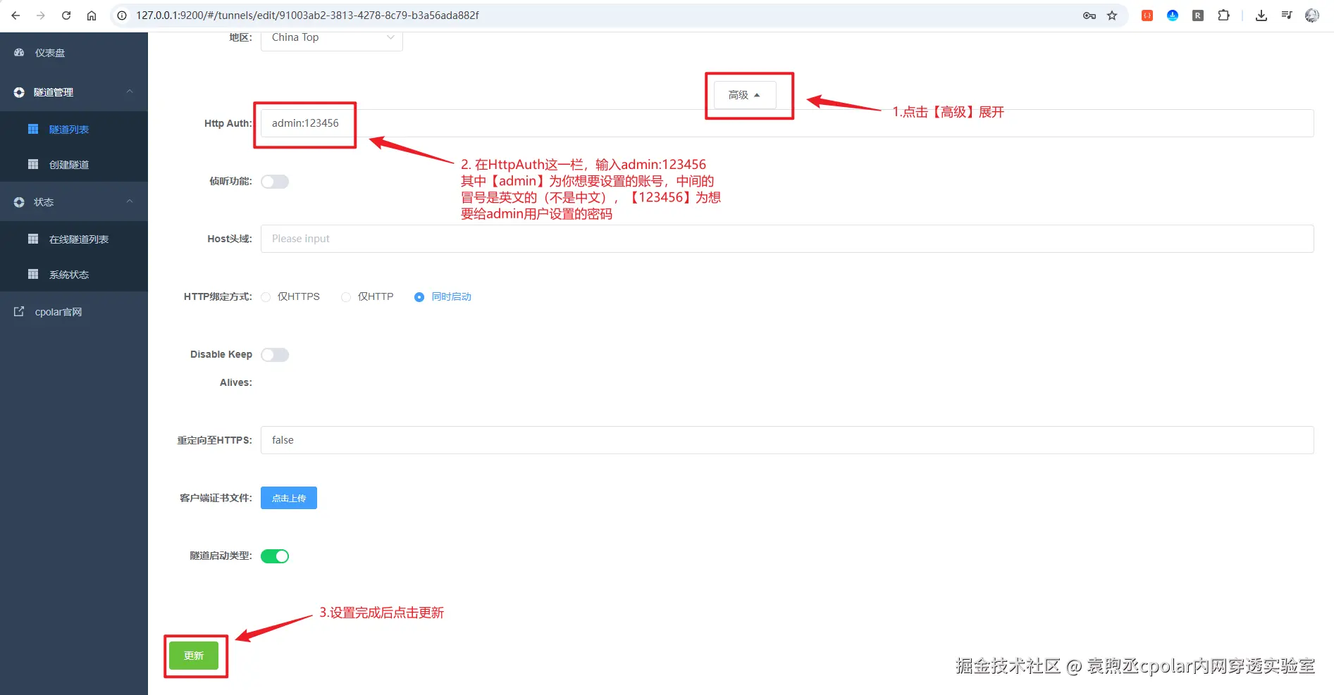 在HttpAuth这一栏,输入admin:123456 其中【admin】为你想要设置的账号,中间的冒号是英文的(不是中文),【123456】为想要给admin用户设置的密码