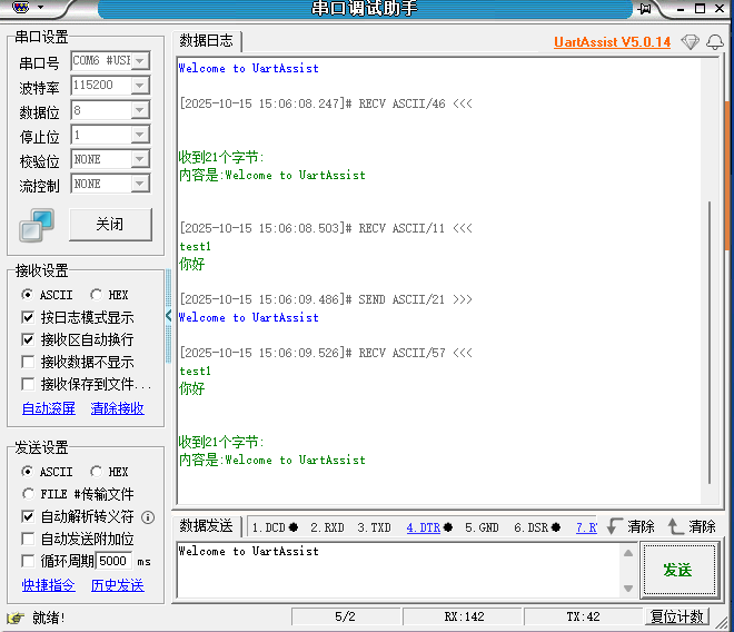 使用USB数据线连接GT7000的USB_Hs接口与PC端,运行程序,串口中不断接收到test1和你好,当向串口发送数据时,能正确显示数据和字节。
