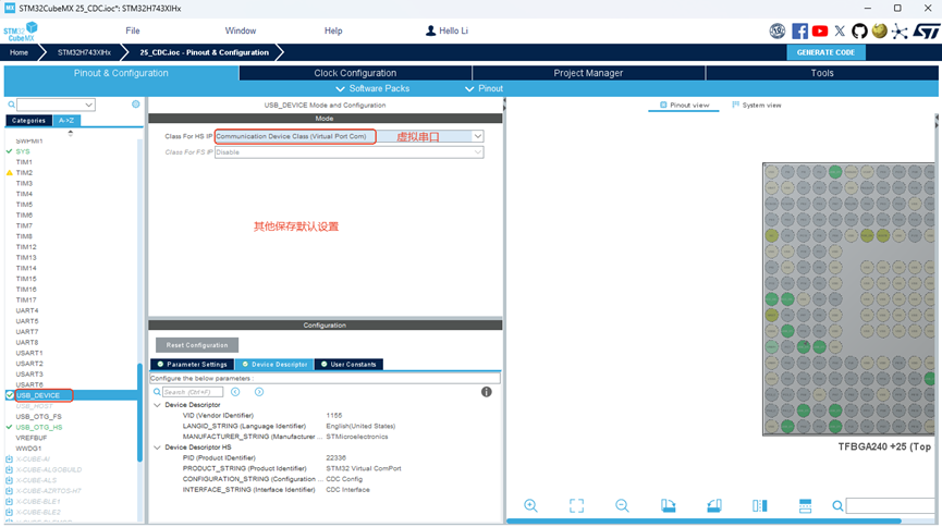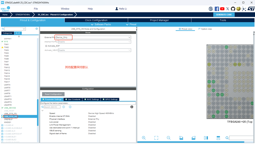 我们参考前面章节STM32H743-结合CubeMX新建HAL库MDK工程,打开CubeMX软件,重复步骤不再展示,我们来看配置USB部分如下图所示:
