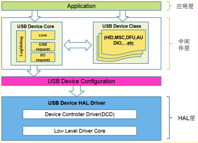 Application为应用层,USB Device Class有可能将自己对应该的操作接口封装在一个操作数据结构中,由应用来具体实现这些操作,在系统初始化时,由应用将已经定义好的操作接口注册到对应的USB类中,比如usbd_cdc_if,就这样,使得应用层的应用代码与属于中间件层的USB协议栈分离。同时,USB协议栈会将一些字符串描述符放到APP中,当USB初始化时将这些已经定义好的字符串通过指针初始化到USB协议栈中,以便后续需要时获取。