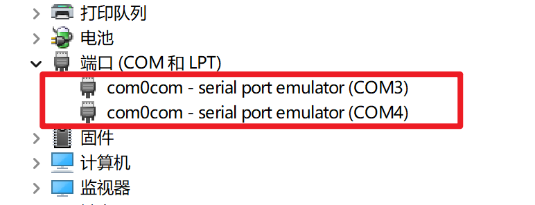 在WINDOWS平台上,可使用开源的COM0COM建立虚拟串口对,建好的串口对实质上是两个串口的RX与TX互接,向其中的一个端口发送数据,则可以在另一个端口上接收。比如建了COM3和COM4一对虚拟串口,在windows平台的设备管理列表上看到的是下面的样子,使用起来和真实串口几乎无异,用它进行不同应用程序间的数据收发是比较方便的。