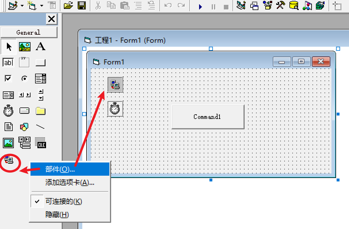 VB6加上部件Winsock如下图,再放一个Timer,定时间隔1000毫秒,按Command1按钮。