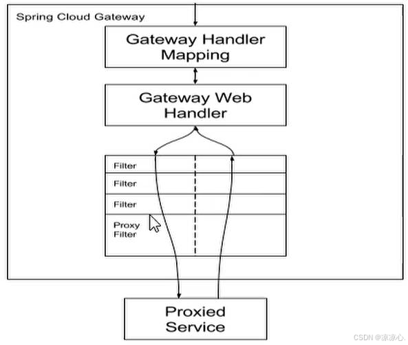 客户端向SpringCloud Gateway发出请求。然后再Gateway Handler Mapping中找到与请求相匹配的路由,将其发送到Gateway Web Handler