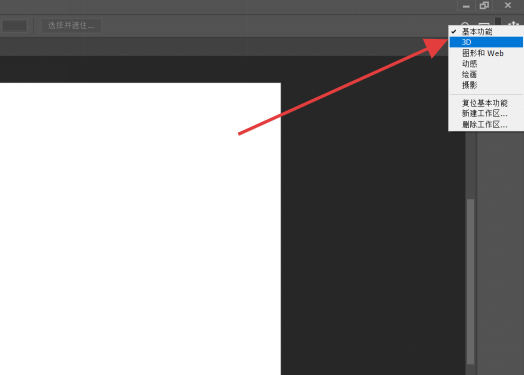 在使用PS时,添加图层是一种常规操作,点击右上角的工作区,然后点击3D: