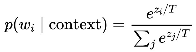 p(w_i \mid \text{context}) = \frac{e^{z_i / T}}{\sum_j e^{z_j / T}}