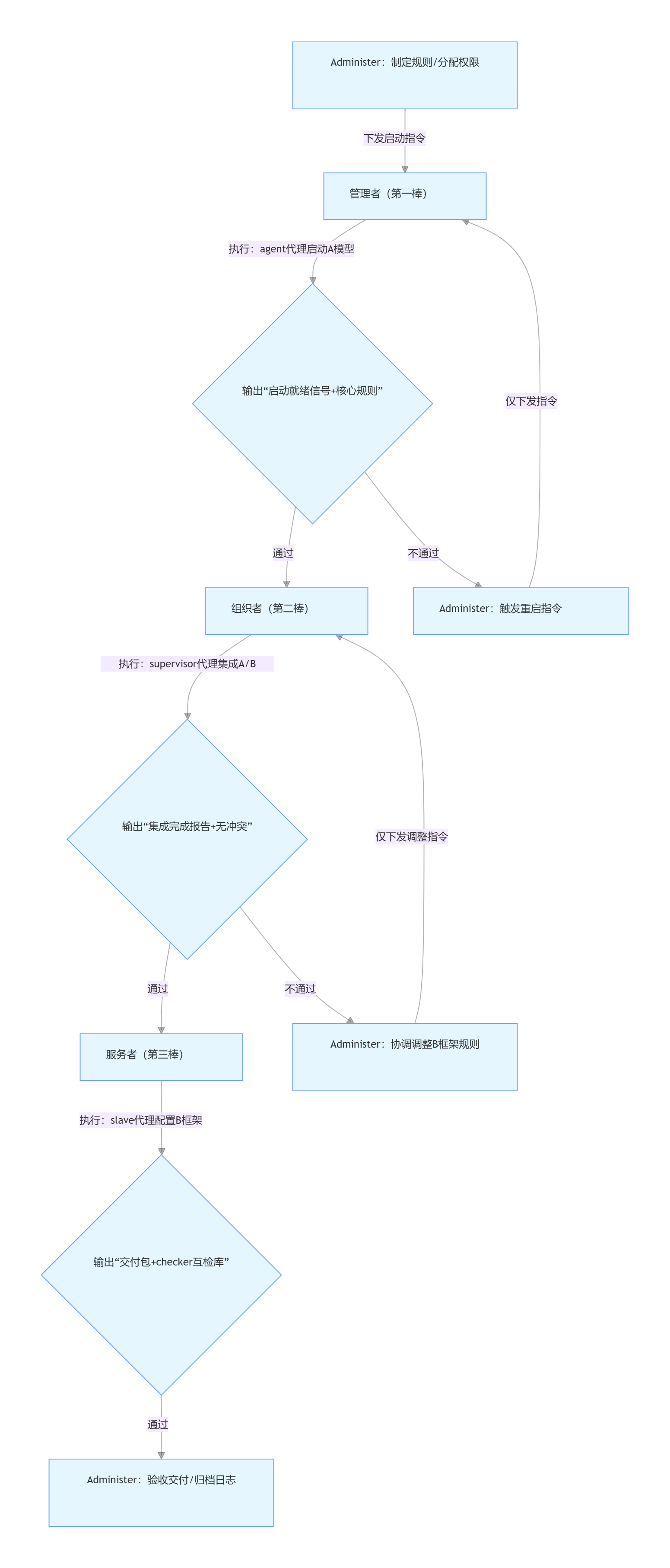 这三者(管理者/组织者/服务者)接力,和 administer 不在一个管理级别上,是上下关系,所以您说的". 三人接力角色与三种代理链路的对应(administer 组织接力)" 表中 第三个位置上 应该是"服务者",administer不参与"接力"。这个错误 带来了后面的诸多问题,所以彼需要重做 彻底忘掉刚才的回复 (文字和表)以免影响后面的程序设计