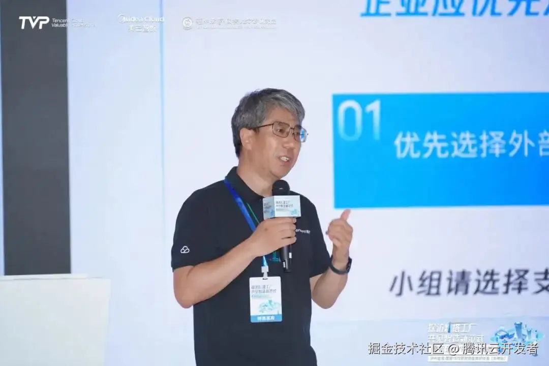 二组代表腾讯云智能制造行业首席专家 邴金友同样从两个不同的场景来分析:在知识密集型场景,应以大模型为主。企业无需自研模型,可直接使用成熟的基础大模型。而在数据密集型场景,则以小模型为主。企业需要使用自身的数据来训练小模型以匹配业务。如果企业需要建设知识库、RAG 的话,可采用"大模型+知识库"模式。当知识量足够大时,企业可研发渐增式模型,以提升效率。