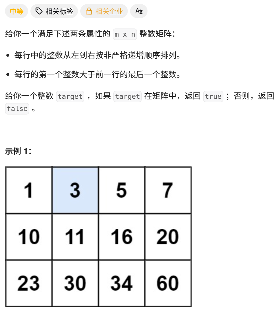 分析:就是朴素二分查找,只不过要把一维坐标映射为二维坐标,来获取矩阵元素值。