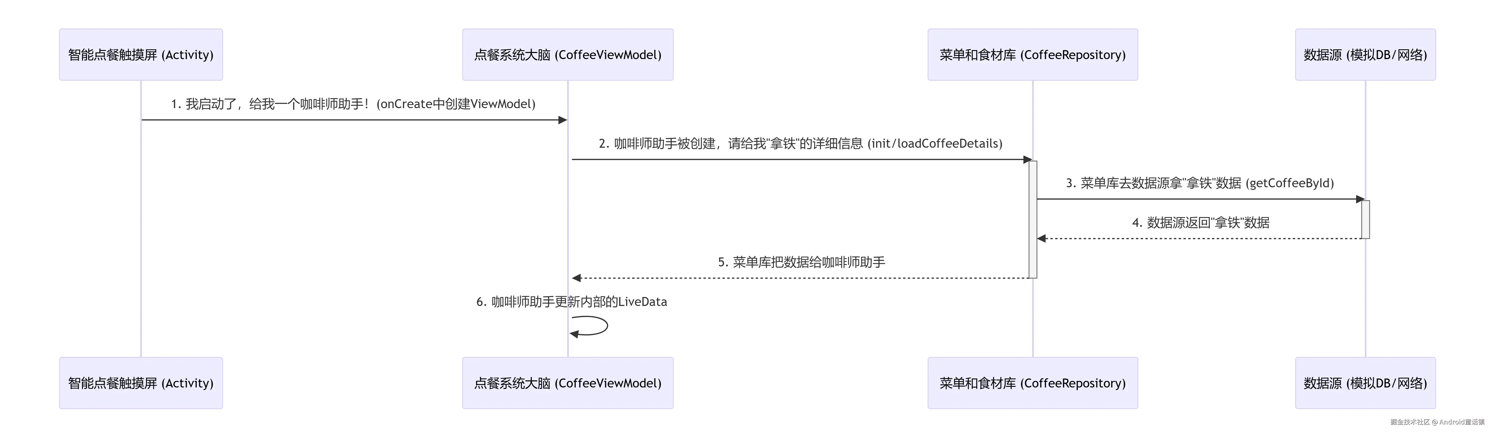 LiveData :透明的咖啡制作进度牌。当咖啡师助手(ViewModel)告诉厨房(Model)去做咖啡时,厨房会把制作进度实时更新到这个进度牌上。触摸屏(View)只要盯着这个进度牌,一有更新就立即显示给顾客看,而不需要一直去问厨房"做好了没?"