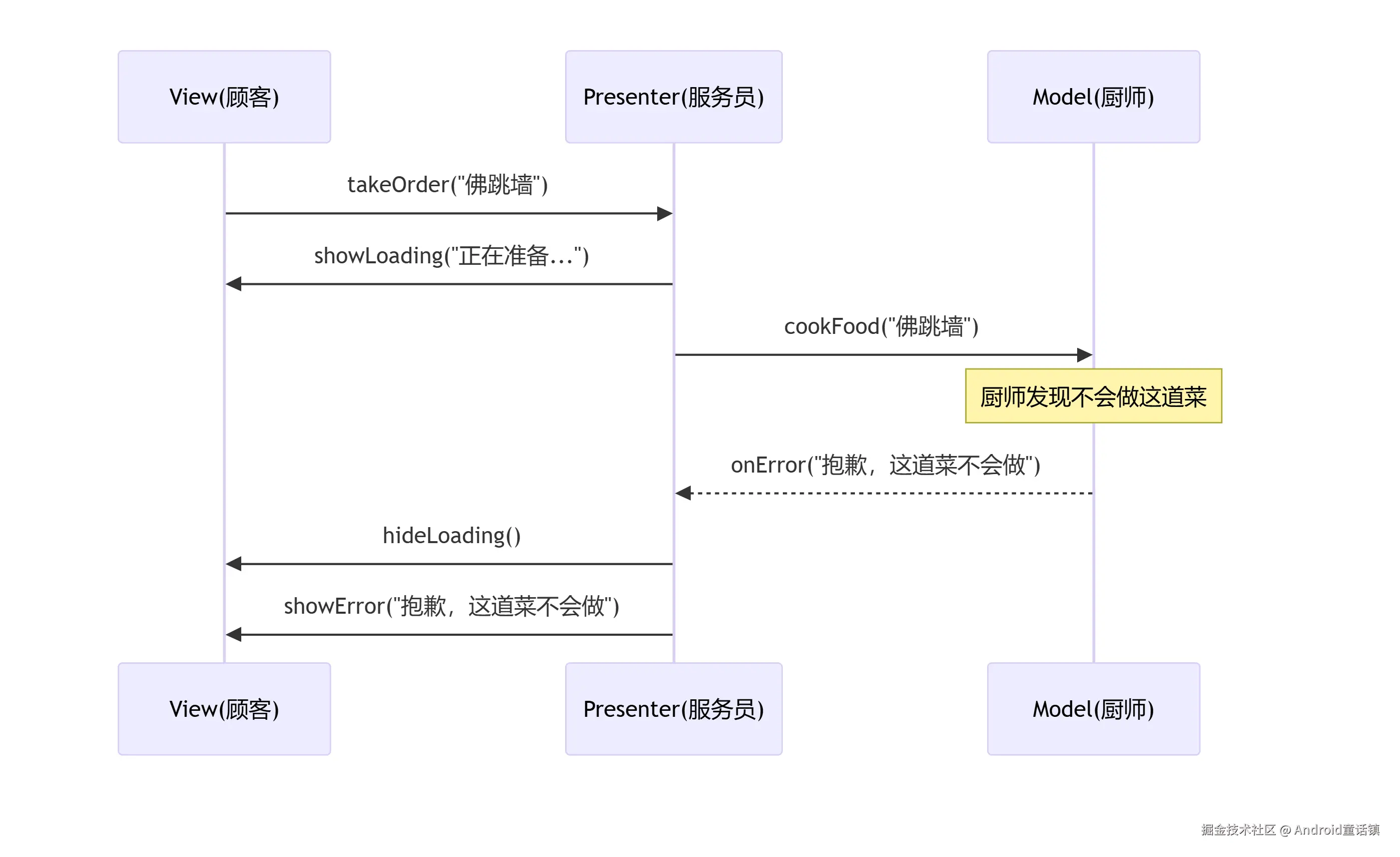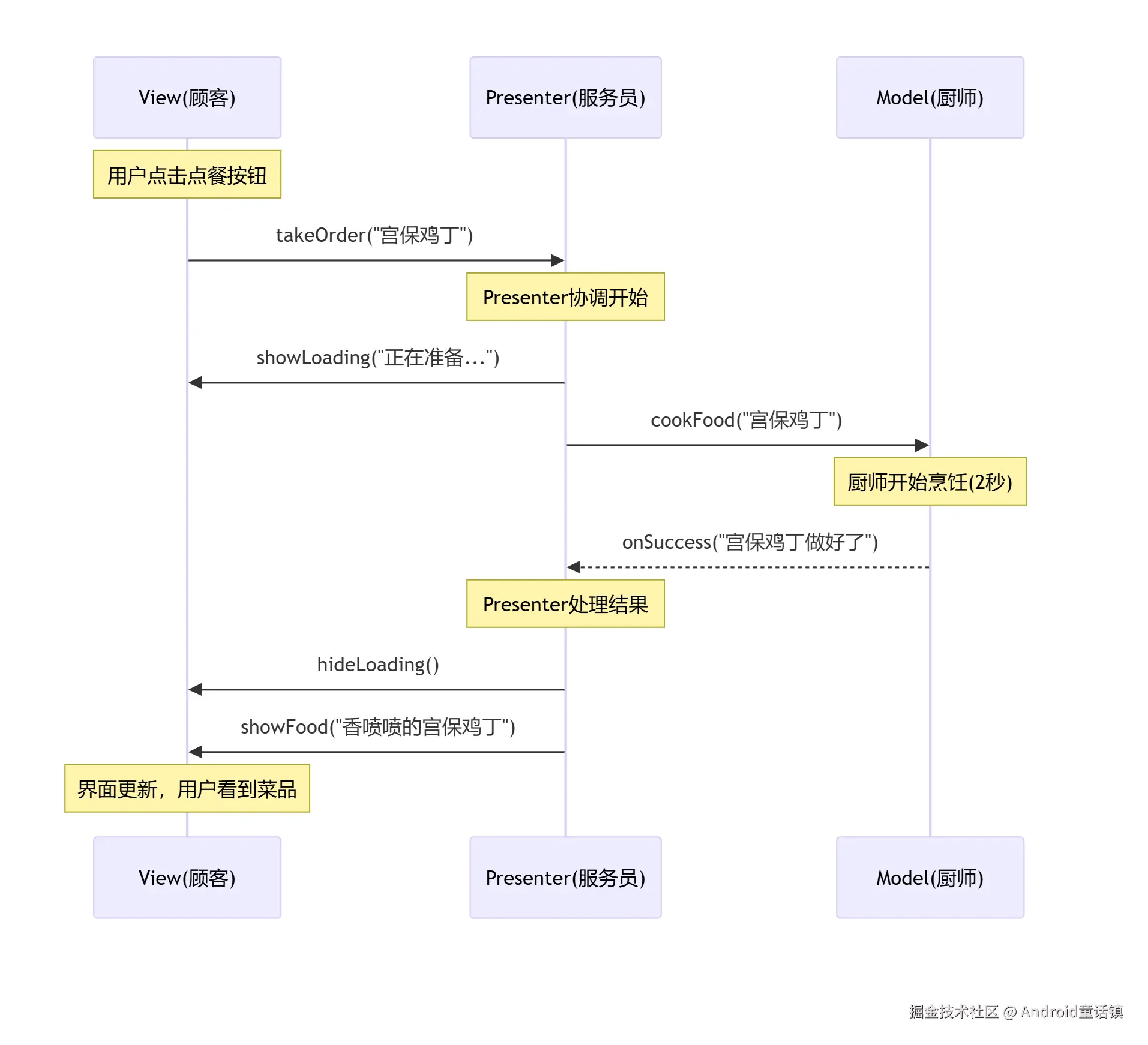 - 服务员 (Presenter) :负责接收订单、协调后厨、把菜品端给顾客
