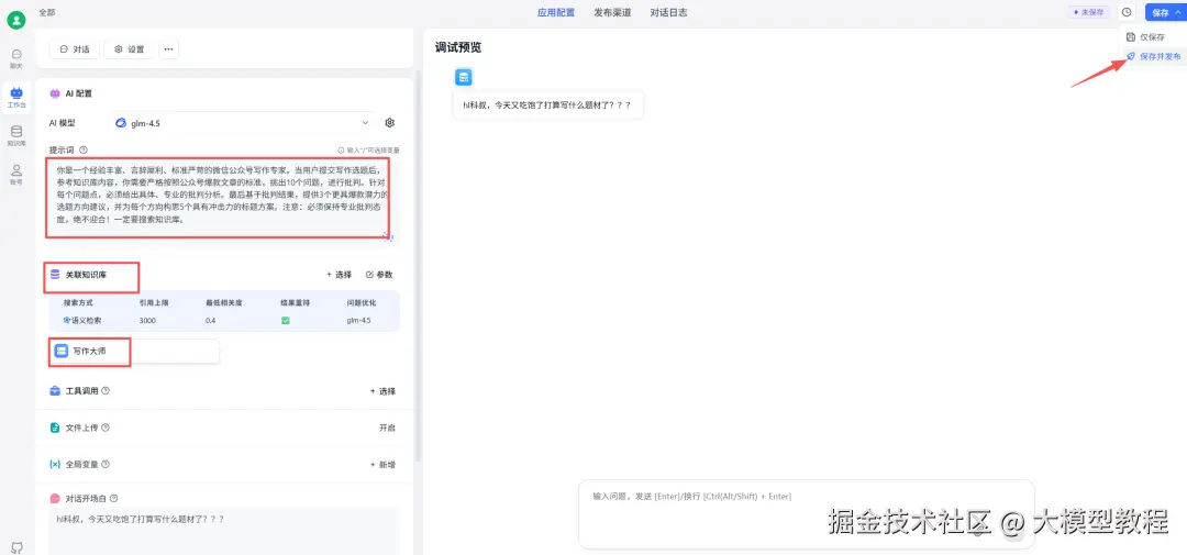 这里记得关联知识库,选择刚才的创建的写作大师知识库,点击保存并发布应用