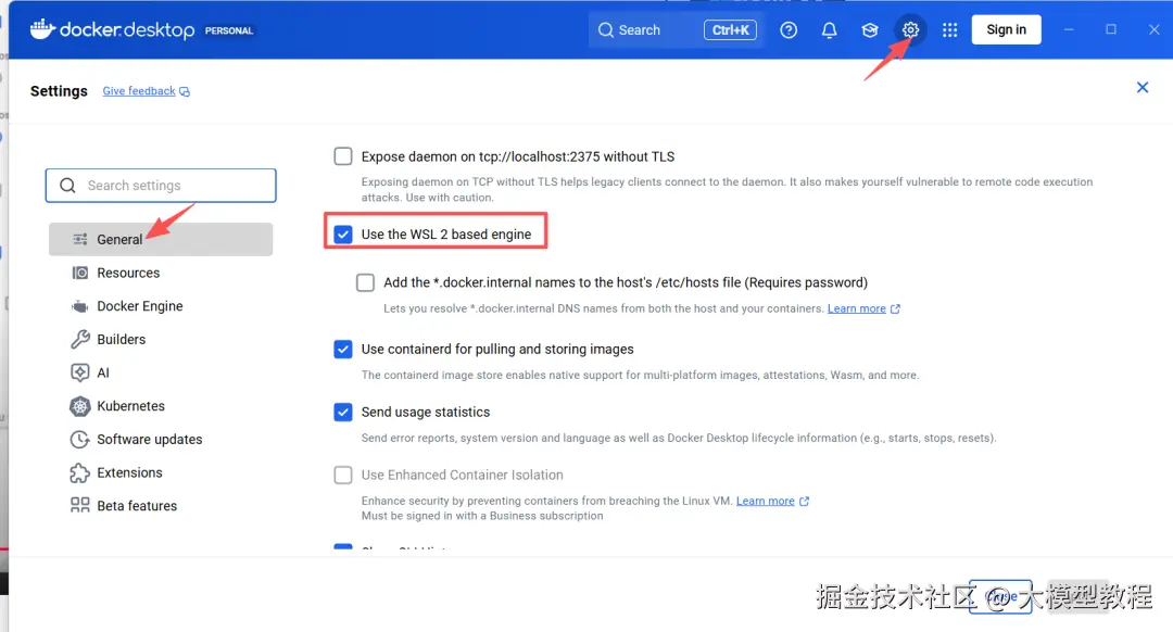 再次检查以下 确认是否勾选 Use the WSL 2 based engine
