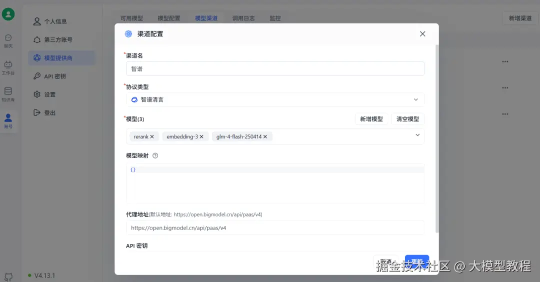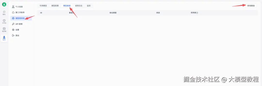 依次点击,模型提供商 - 模型渠道 - 新增渠道