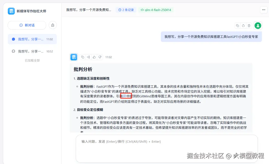 很快写作大师进行了批判,生成速度非常快!而且FastGPT在引用知识库标记了引用来源