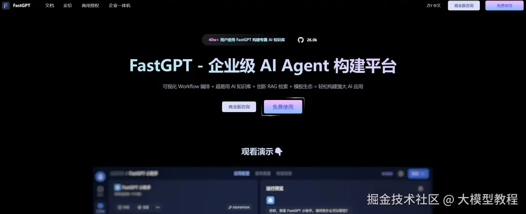 最近有小伙伴问,有没有其他好用的免费 AI知识库搭建工具。我跟你说,还真有,在国内有一个叫FastGPT的工具,是可以搭建AI知识库的,而且免费开源,口碑也很好。它可以下载到本地,私有化搭建部署,目前在Github上面已经获得了26k Star,功能非常强大!