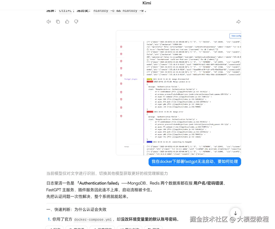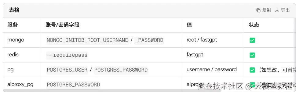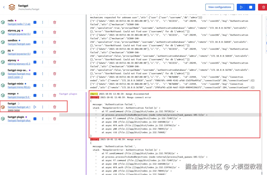 显示是由于 fastgpt 服务的数据库连接配置不正确导致的,需要修改config.json 和 docker-compose.yml redis、mongodb、postgres 账号密码对齐。