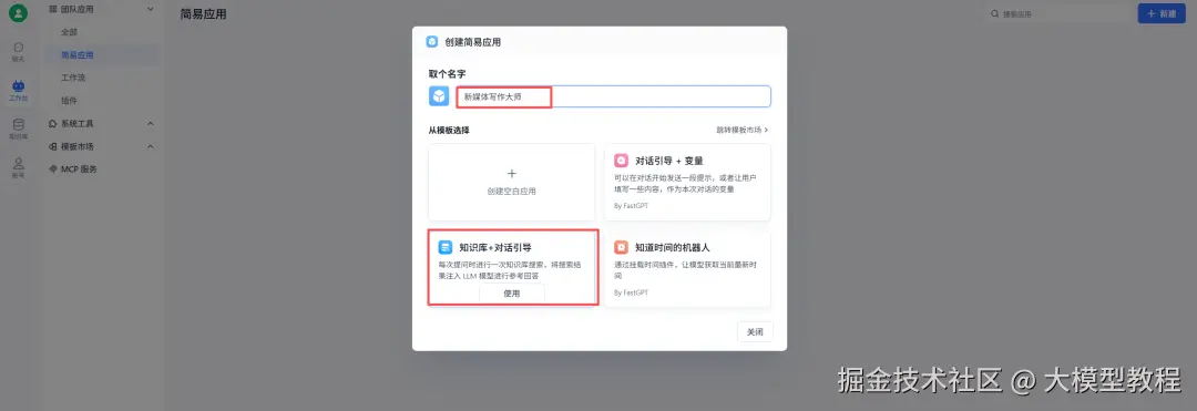 在左侧工作台 - 简易应用 - 创建一个新媒体写作抬杠大师应用