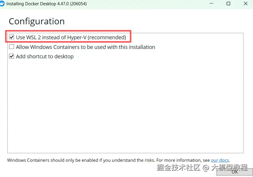 在安装时候,务必勾选 Use WSL2 instead of Hyper-v