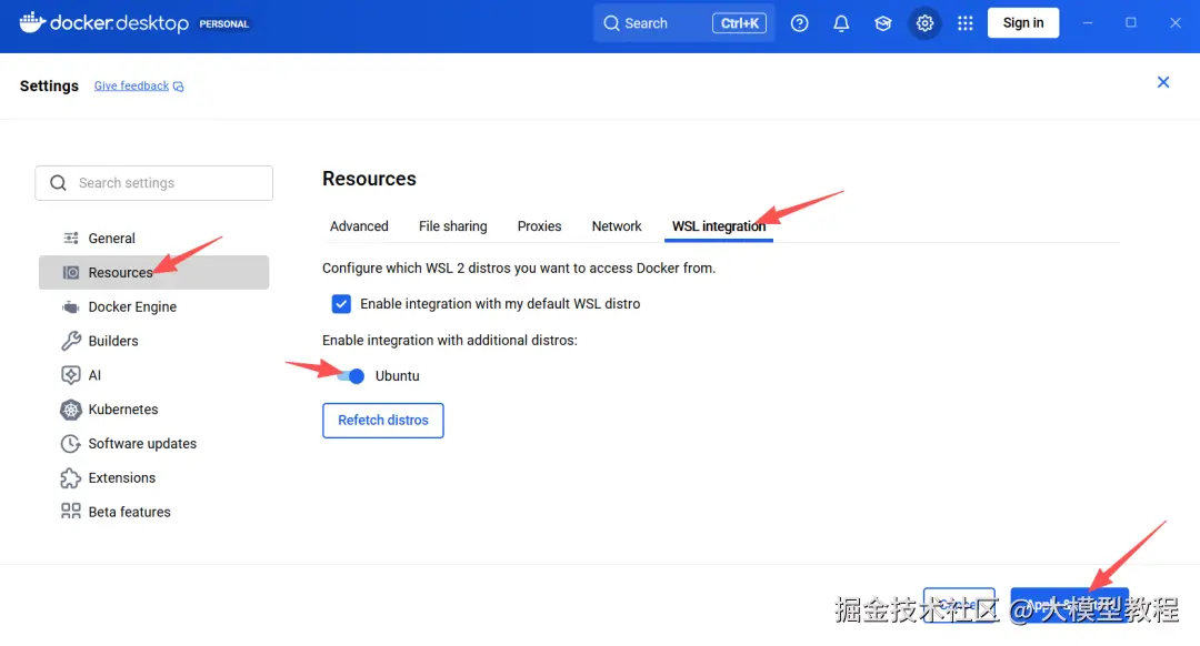 然后在 Resources 查看 WSL intergation 勾选Ubuntu选项