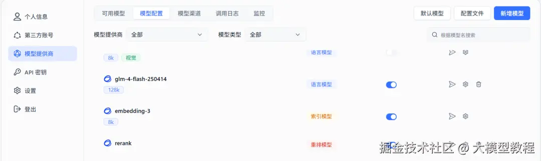 对话模型(需要自己新增):glm-4-fash-250414 参考:docs.bigmodel.cn/api-referen...