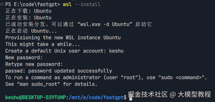 安装WSL,输入以下命令,并配置Ubutu子系统用户和密码,