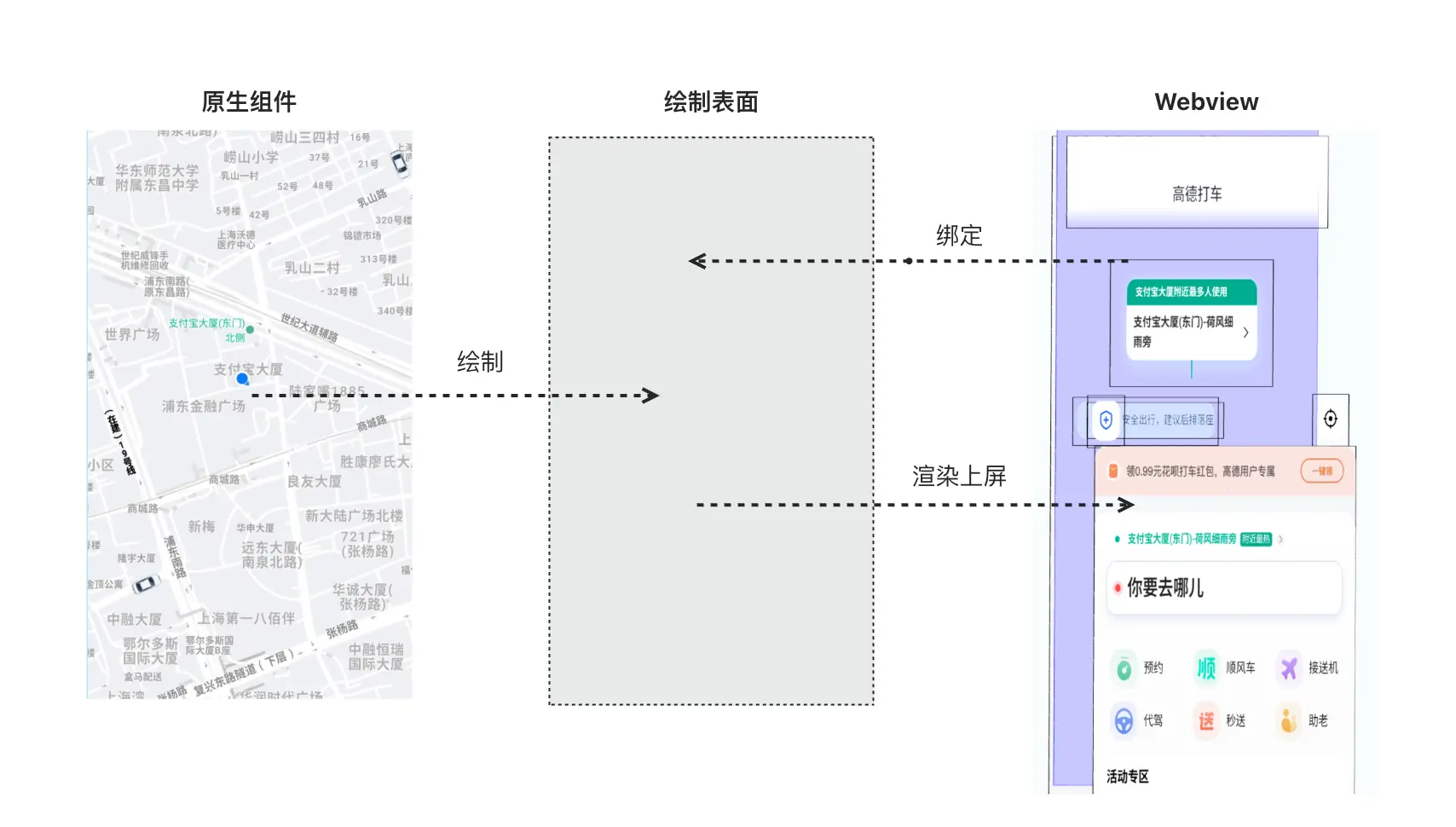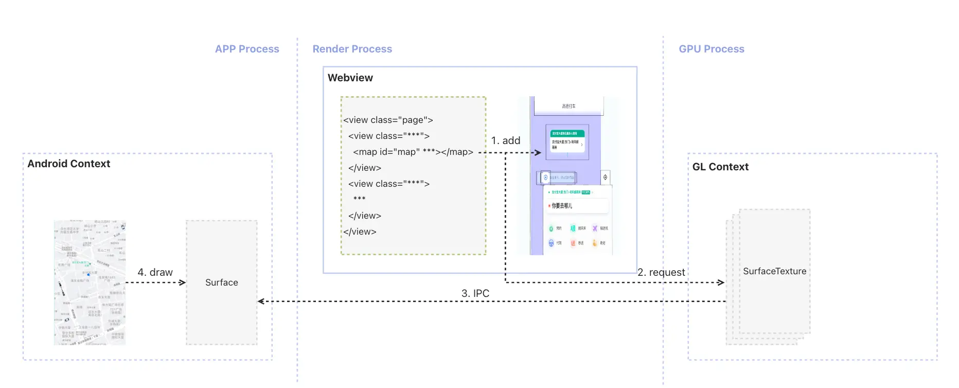 当一个 Native 组件需要绘制到 WebView 中时,通常要 共享 WebView 的一块 texture,让 Native 渲染管线把自己的内容写入该缓存中,再由 WebView 完成布局、渲染、合成与上屏。