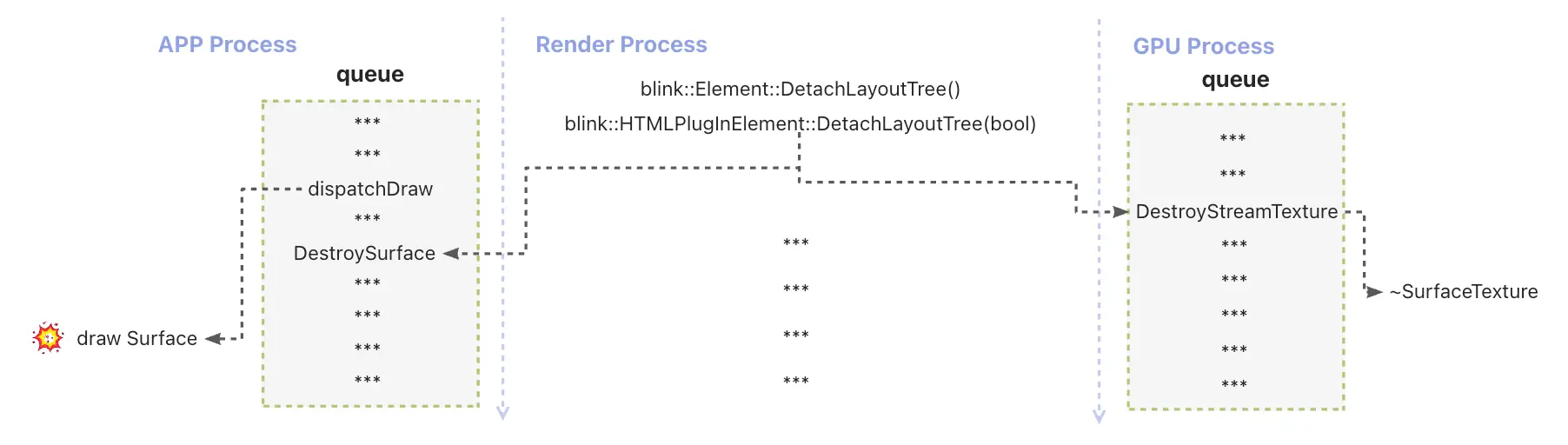 在极端情况下,由于 App 进程任务繁忙,导致未能及时处理来自 Render 进程的销毁事件。此时若 GPU 进程 更早地完成了纹理的销毁,就会出现"通信通道仍在,但消费者已被释放"的不一致状态。