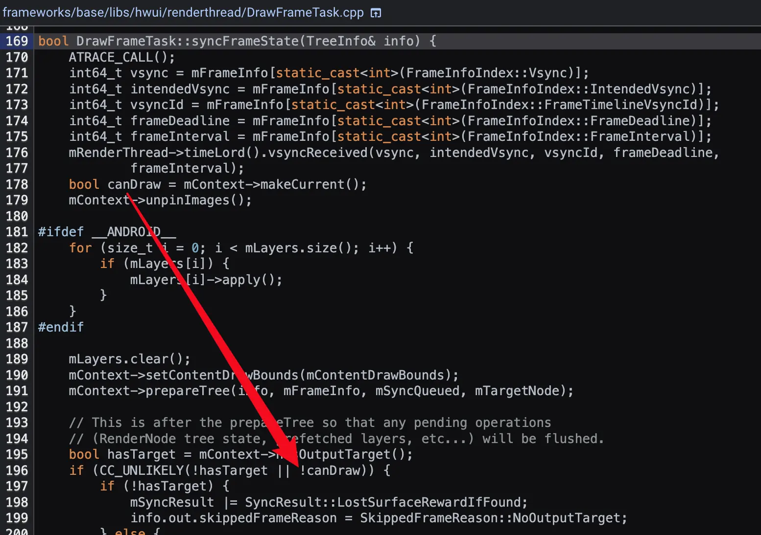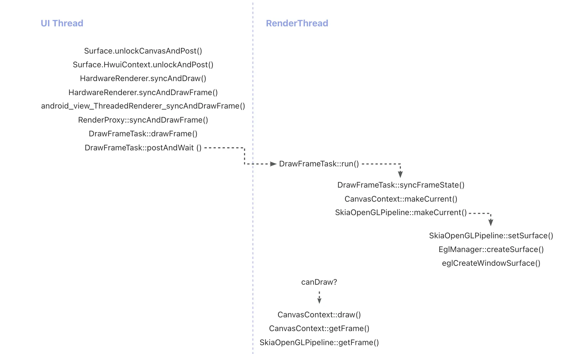 UI 线程的调用后,RenderThread 的异步绘制任务 DrawFrameTask::run() 在 draw() 之前就已经通过 DrawFrameTask::syncFrameState() -> CanvasContext::makeCurrent() -> SkiaOpenGLPipeline::makeCurrent() 来保证当前渲染上下文可用。