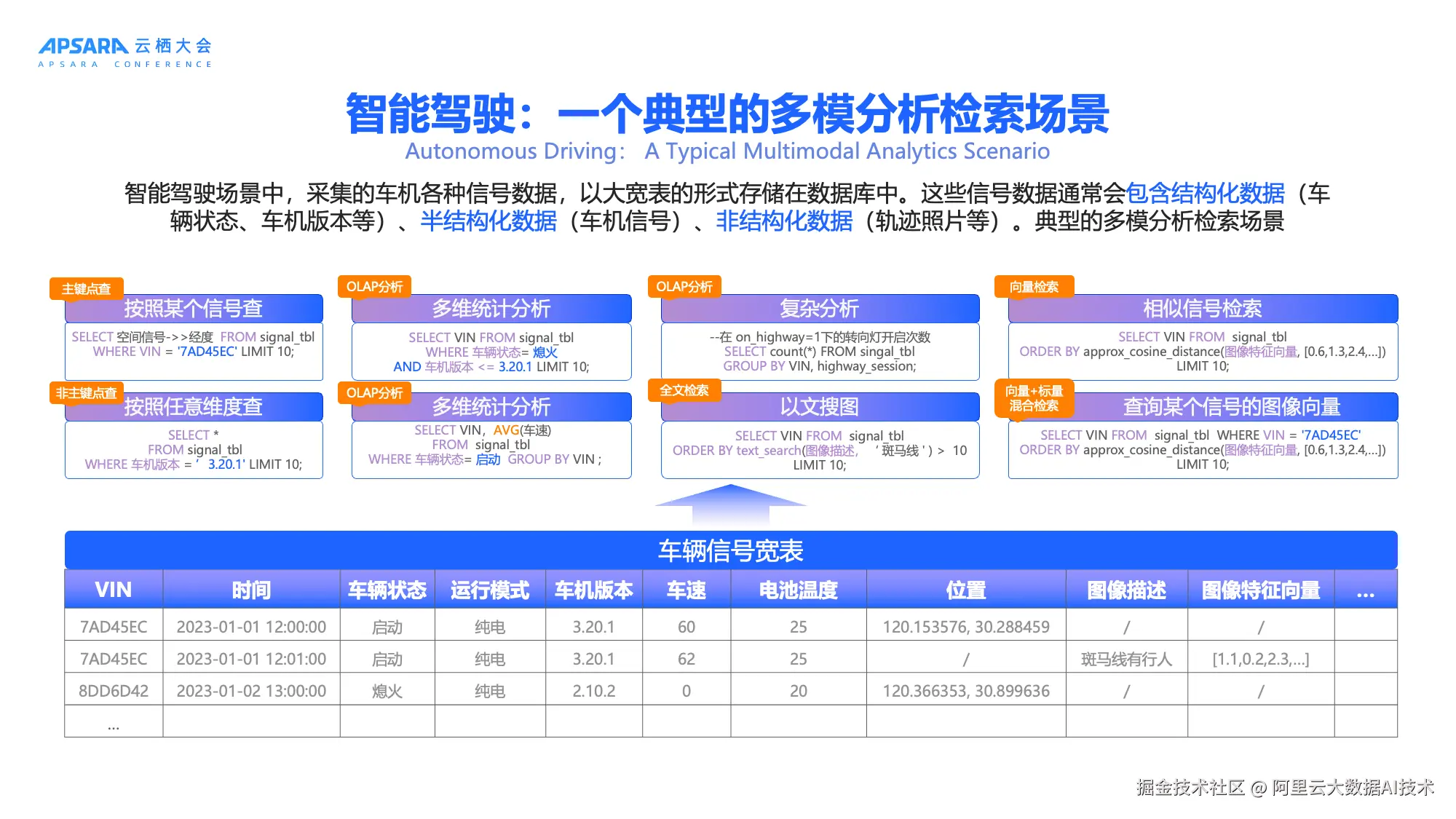 以电商行业为例,用户不仅需要通过关键词搜索商品,还期望实现"以图搜图"或"以文搜图"的智能推荐;在智能驾驶领域,车辆采集的信号数据既包括车速、电池温度等结构化字段,也包含图像描述、轨迹图片等非结构化信息,需支持按VIN号点查、多维统计分析、相似图像检索等多种操作;游戏行业则面临直播内容生成、玩家行为反作弊、个性化内容推送等挑战;金融与教育行业同样依赖合同文本合规审查、个性化投资建议、以图搜题等高级功能。 用智能驾驶一个典型的场景举例,可以看到智能驾驶场景中,采集的车机各种信号数据,以大宽表的形式存储在数据库中。这些信号数据通常会包含结构化数据(车辆状态、车机版本等)、半结构化数据(车机信号)、非结构化数据(轨迹照片等)。在业务应用的时候,要进行点查、OLAP分析、全文检索、向量检索、混合检索等多种场景。