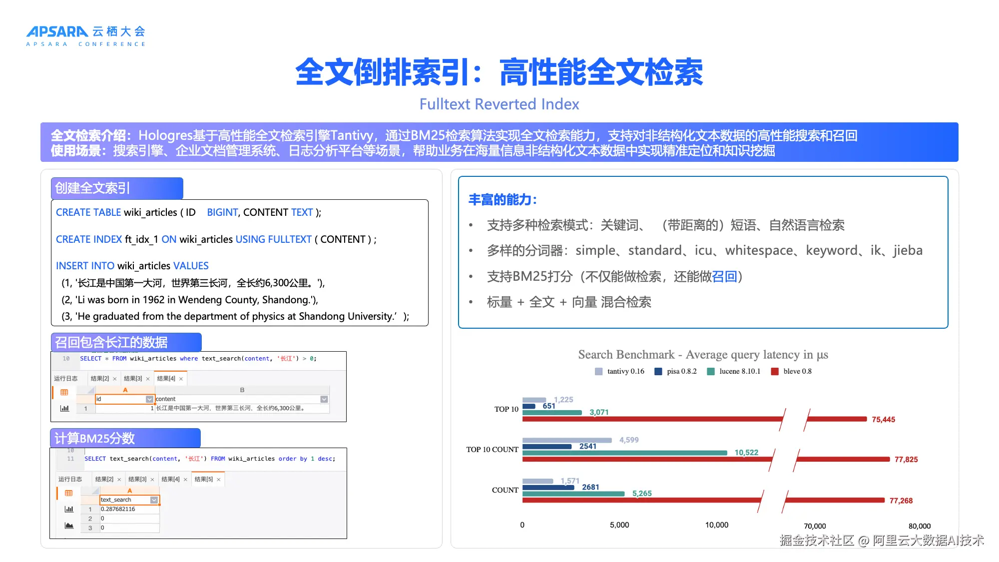 Hologres 4.0正式发布原生全文检索能力,基于高性能开源引擎Tantivy构建,采用BM25算法实现精准召回。
