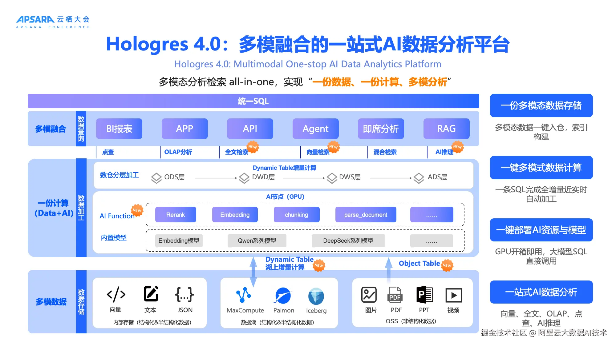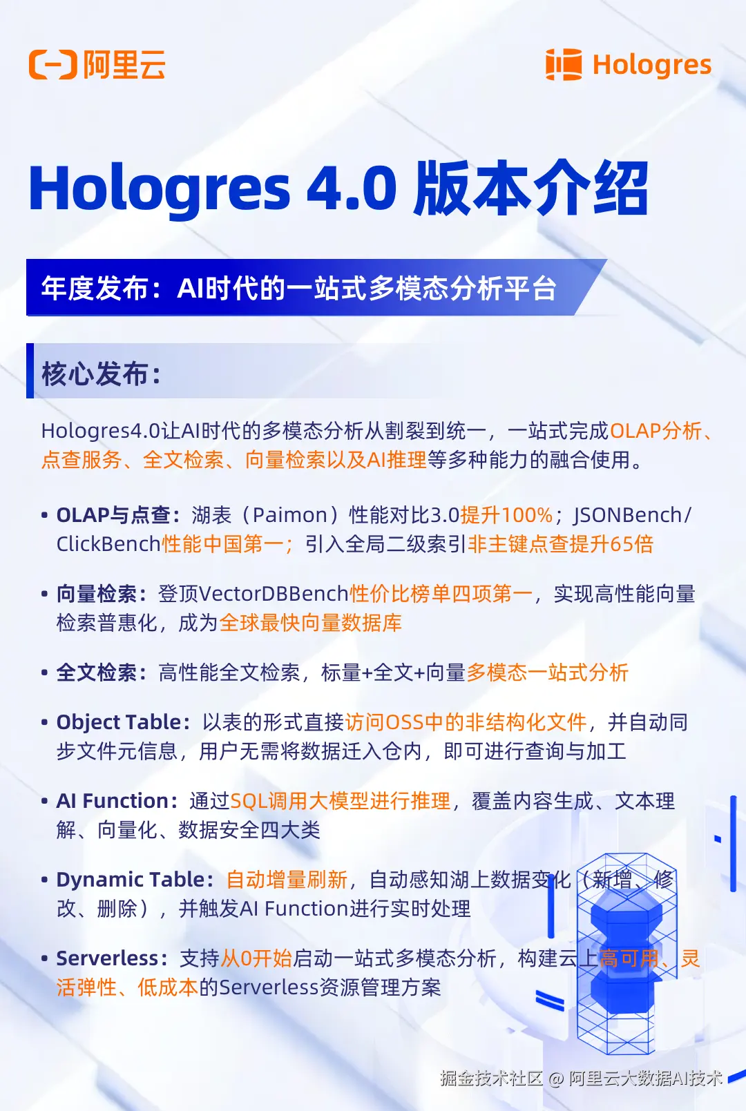 - Hologres 4.0(HSAP 2.0):Data+AI一体化架构火热,全面升级为"分析检索一体化"平台,集成向量、全文、混合检索能力,内置AI Function,支持大模型SQL调用,成为AI时代的全栈数据分析引擎。