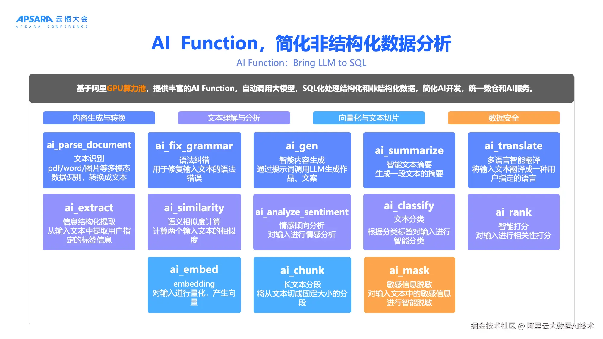 Hologres 4.0内置丰富的AI Function,覆盖内容生成、文本理解、向量化、数据安全四大类: