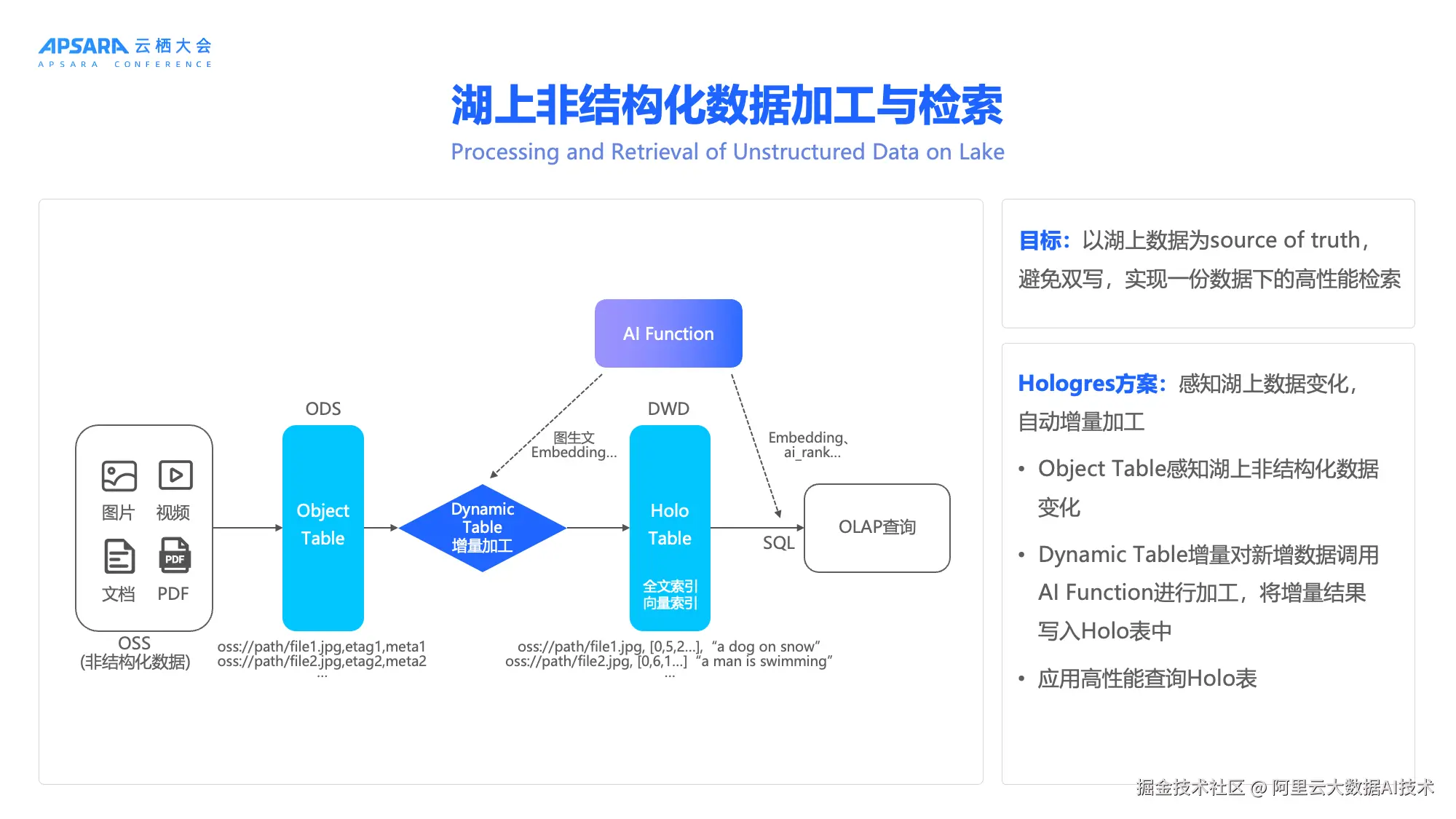 - 非结构化数据:通过Object Table接入OSS中的图片、PDF、PPT、视频等文件,将其映射为可查询的表结构。