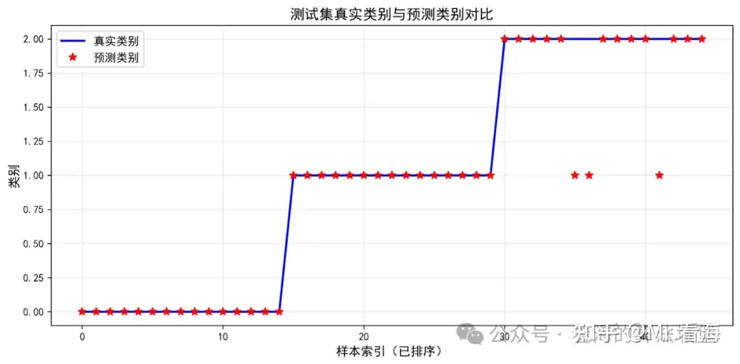这张图直观地展示了每个样本的预测情况。横坐标是样本编号,纵坐标是类别(Setosa、Versicolor、Virginica),蓝色'o'是真实类别,红色'x'是预测类别。两者完全重合,说明所有样本都预测正确!