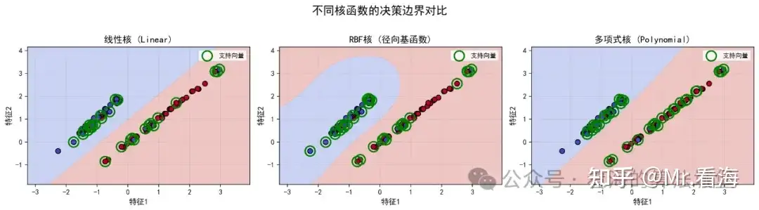 在这个过程中,有几个关键概念需要理解。首先是超平面(Hyperplane) ,在二维空间是一条直线,在三维空间是一个平面,在高维空间就是"超平面"。其次是间隔(Margin) ,指的是两类数据到分界线的最小距离。最后是支持向量(Support Vectors),这些是距离分界线最近的那些关键样本点,在图中用绿色圈标记。